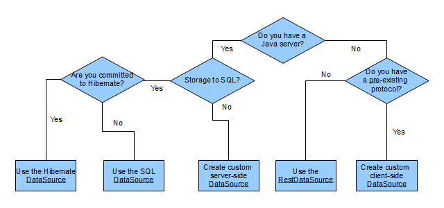 Smart GWT supports, out of the box, codeless connectivity to various kinds of common data providers, including SQL and Hibernate. Smart GWT also provides functionality and tools for accelerated integration with broad categories of data providers, such as Java Object-based persistence mechanisms (JPA, EJB, Ibatis, in-house written systems), and REST and WSDL web services in XML or JSON formats. Ultimately, a DataSource can be connected to anything that is accessible via HTTP or HTTPS, and also to in-browser persistence engines such as Google Gears.