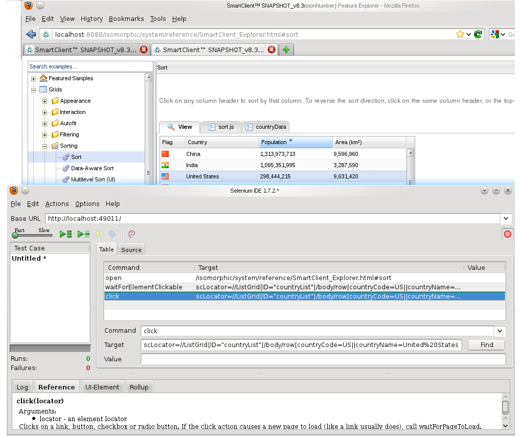 Once you have your application running in Firefox, open Selenium IDE from the Tools ==> Selenium IDE menu option. If the Selenium IDE is in record mode, then clicking or carrying out other operations like typing in a text field with automatically record the appropriate Selenium commands with the Smart GWT locator. In most cases there's no need for you to manually enter the locator, the recorder does this for you! In fact, not only do the provided user extension files record your clicks, drag operations, and typing in the browser--they also try to ensure that your script executes each operaton only when the Smart GWT widgets it depends upon exist and are ready to be interacted with. This ensures that when the test script is executed, then even if one or more triggered operations are asynchronous (delayed), it behaves as expected.
